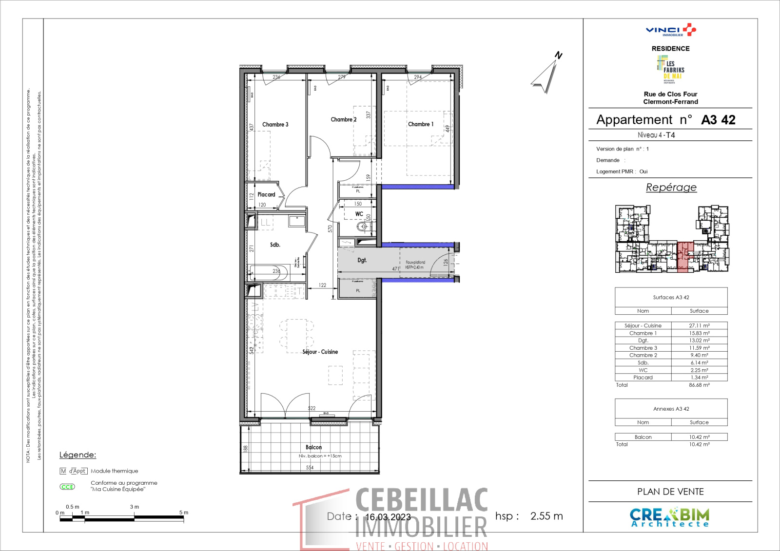 Clermont-Ferrand (63100)MR-CDC-52 - 43 rue du clos four à Clermont Ferrand, dans la résidence récente Les Fabriks de Mai. Situé entre la place du 1er Mai et le stade Marcel Michelin, appartement de type 4 de 87m² habitables situé au 4ème étage avec une terrasse de 10.42m². Il comprend une entrée avec placard, un séjour ouvert sur cuisine aménagée, un cellier, trois chambres dont deux avec grands placards ainsi qu'une grande salle de bains, et un wc indépendant. Chauffage collectif. Deux garages complètent ce bien. Le loyer charges comprises est de 1146.28 euros. Le loyer hors charges est de 904.56 euros. La provision sur charges est de 241.72 euros et comprend l'eau froide, l'eau chaude, le chauffage ainsi que l'entretien et l'électricité des parties communes, et la taxe des ordures ménagères. Dépôt de garantie : 904.56 euros. PAS DE FRAIS D AGENCE. Plafonnement de ressources LLI. Les informations sur les risques auxquels ce bien est exposé sont disponibles sur le site Géorisques : www.georisques.gouv.fr. Vous pouvez retrouver tous nos biens à la location sur notre site immobilier www.auvergneimmobilier.com