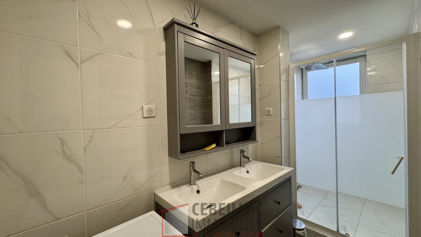 L’appartement se compose d’un salon lumineux de 24 m², offrant un espace de vie confortable et fonctionnel, de deux chambres de 11 m² et 9 m², d’une salle d’eau avec douche, de WC séparés ainsi que de plusieurs placards de rangement optimisant l’espace.