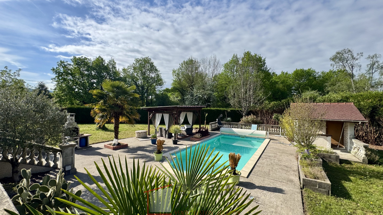 À l’extérieur, la propriété se distingue par ses prestations complètes et rares : une grande terrasse de 75 m², une piscine chauffée de 9 x 4 m, un espace salon de jardin, deux places en carport ainsi que trois ateliers indépendants, idéals pour du stockage, du bricolage ou une activité annexe.