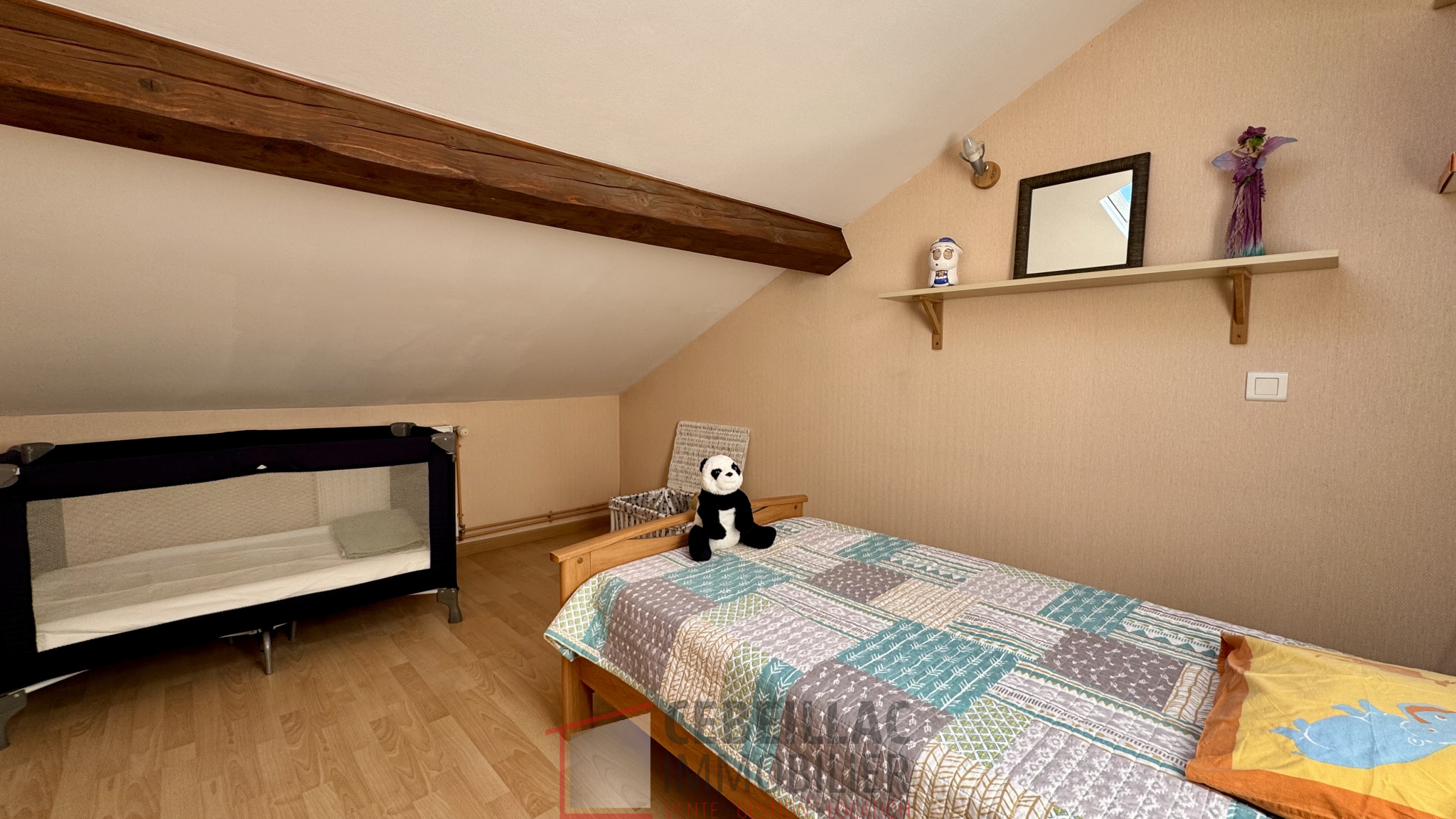 À l’étage, vous découvrirez deux chambres mansardées, un bureau, une salle de bain avec douche d’environ 7 m², un WC indépendant, ainsi qu’une chambre parentale de 16 m² avec dressing.